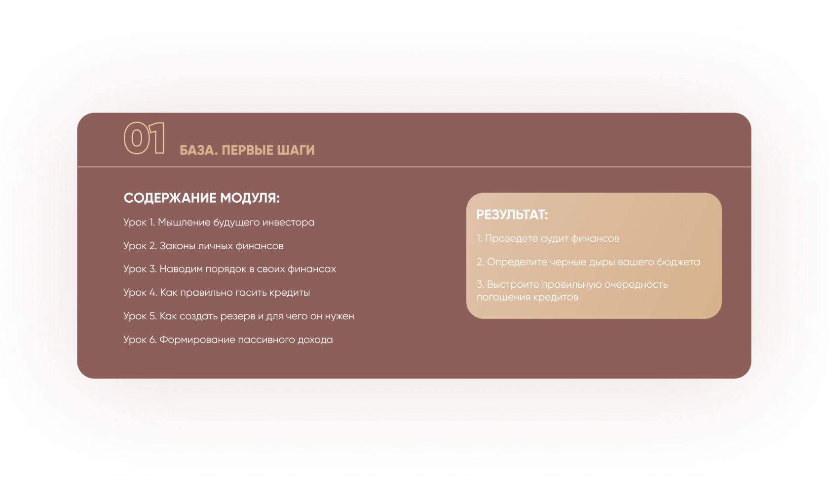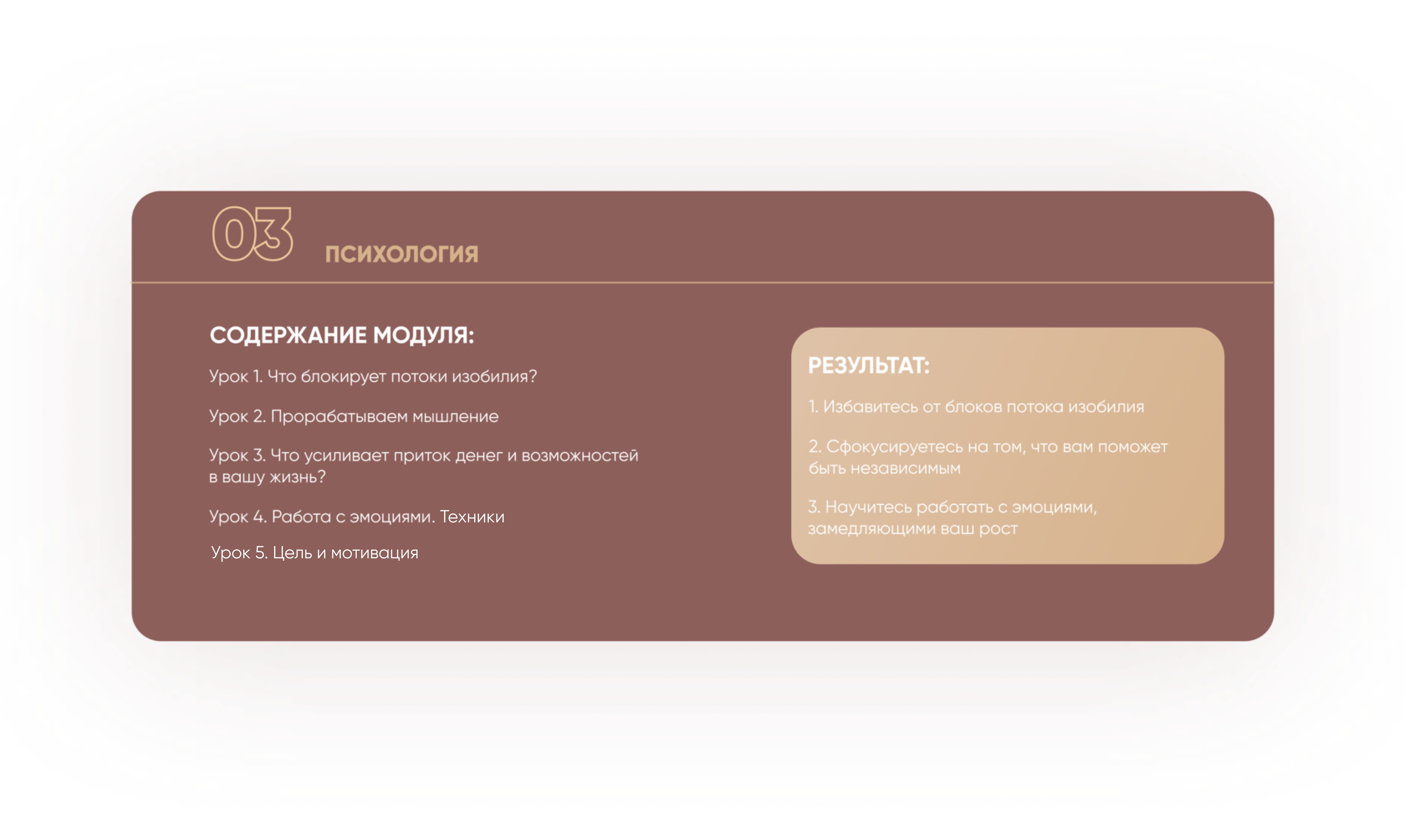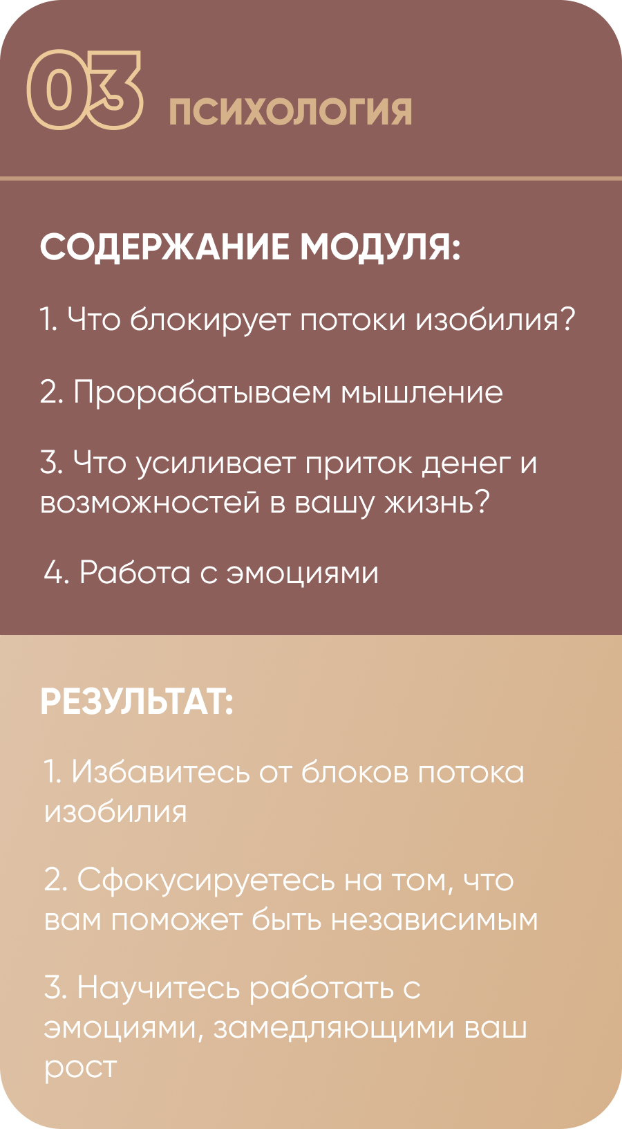 Это записанные видео-уроки на платформе, доступ к которой мы вам предоставим. 6 модулей, включают в себя 47 уроков максимум по 20 минут каждый. Всего 20 часов полезного контента, ваше намерение, и вы поменяете свою жизнь!