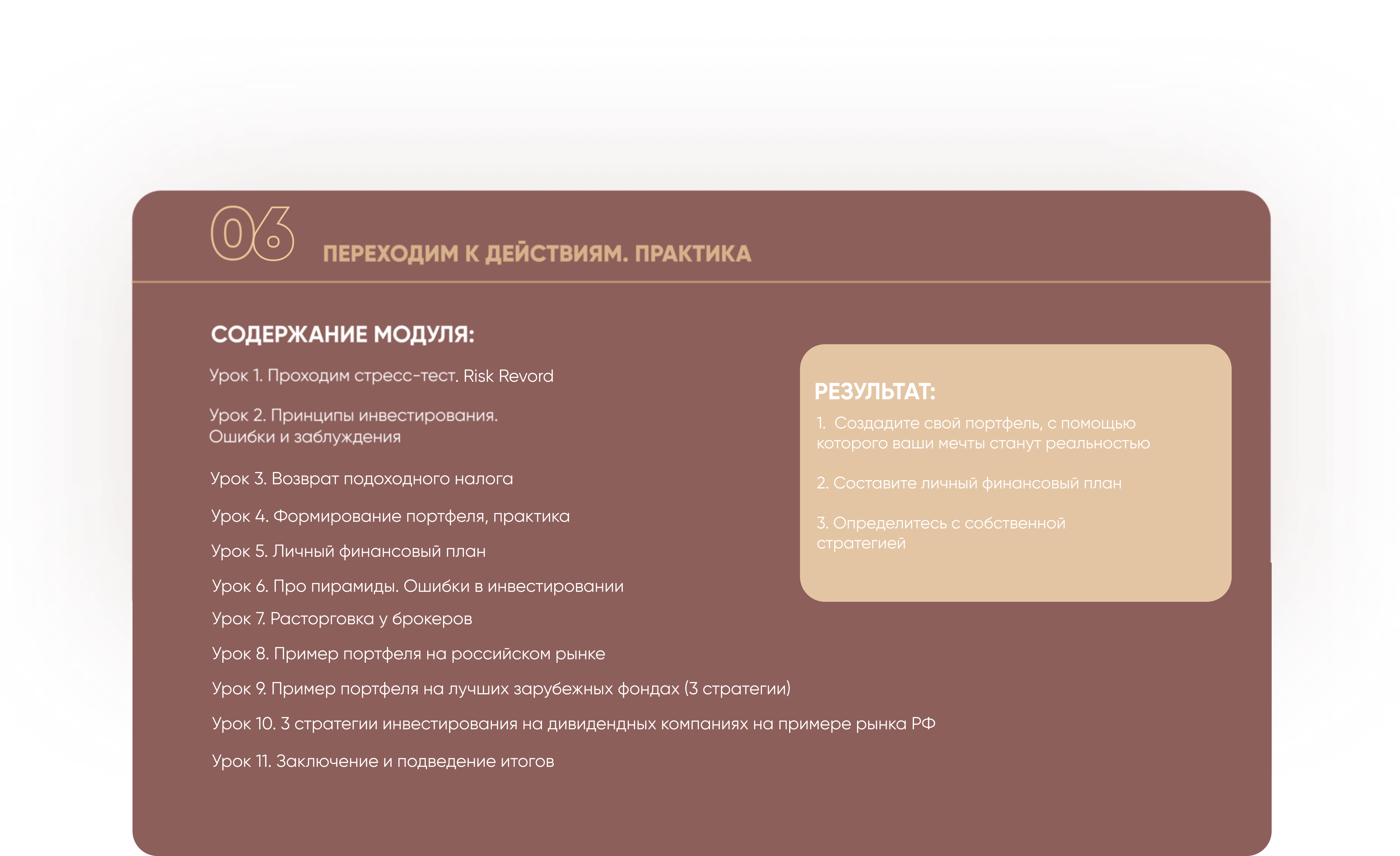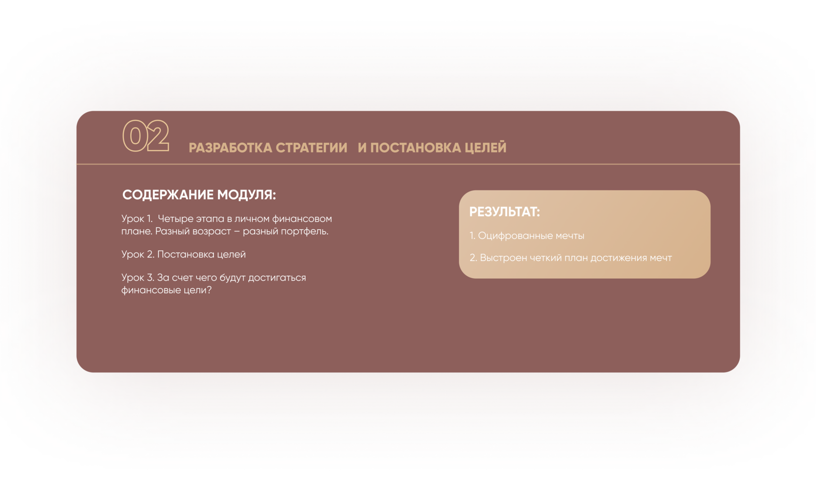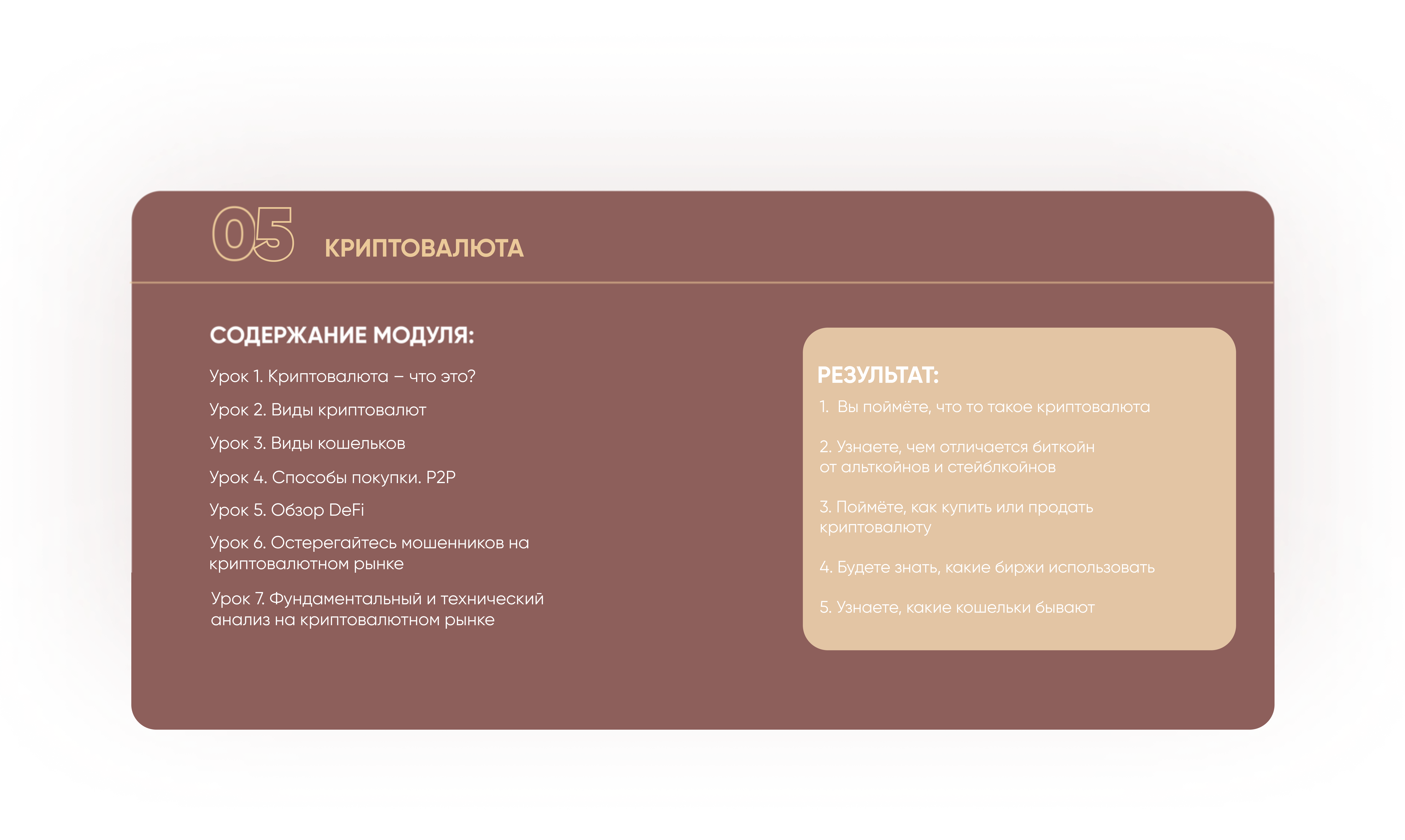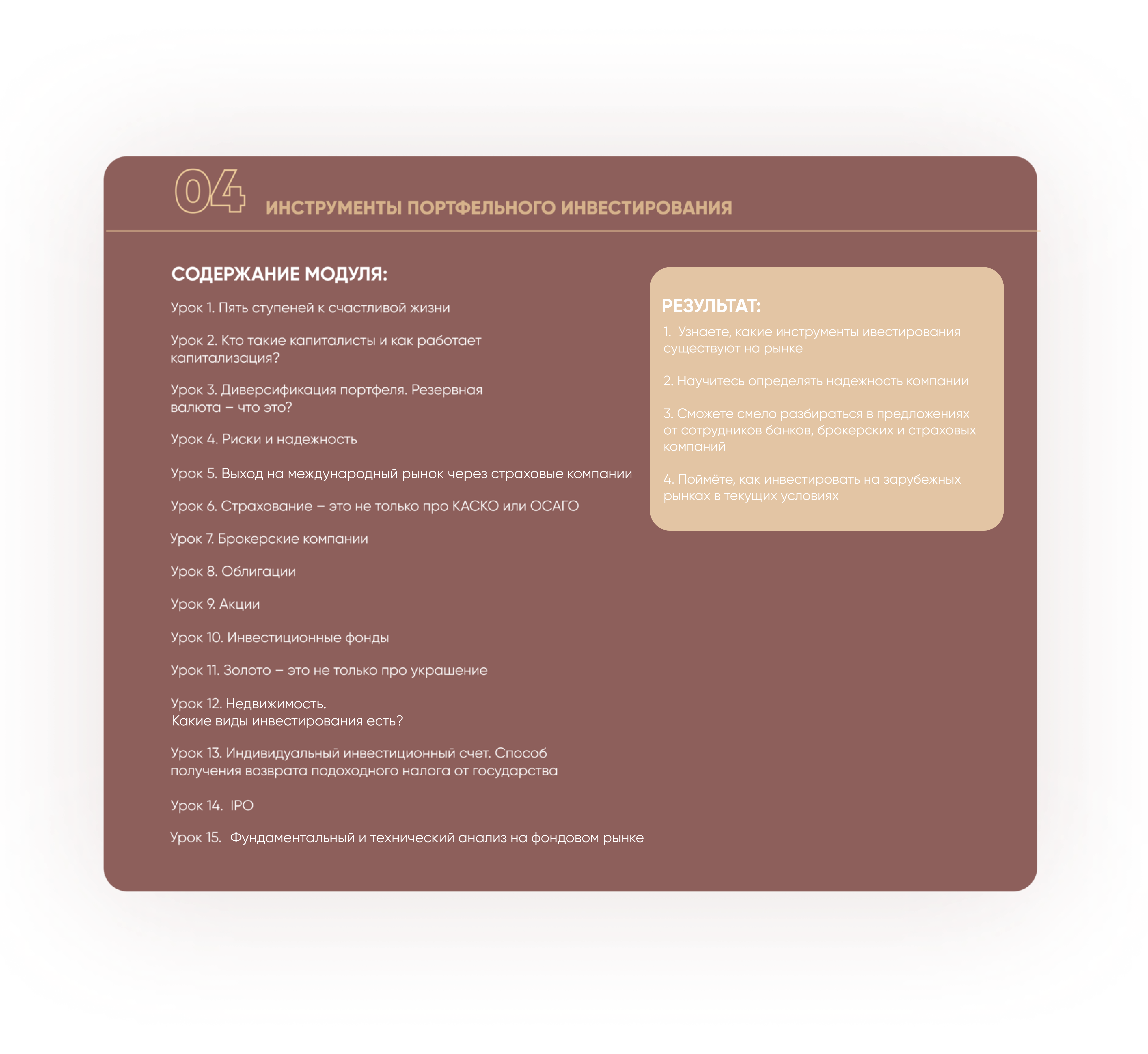Это записанные видео-уроки на платформе, доступ к которой мы вам предоставим. 6 модулей, включают в себя 47 уроков максимум по 20 минут каждый. Всего 20 часов полезного контента, ваше намерение, и вы поменяете свою жизнь!